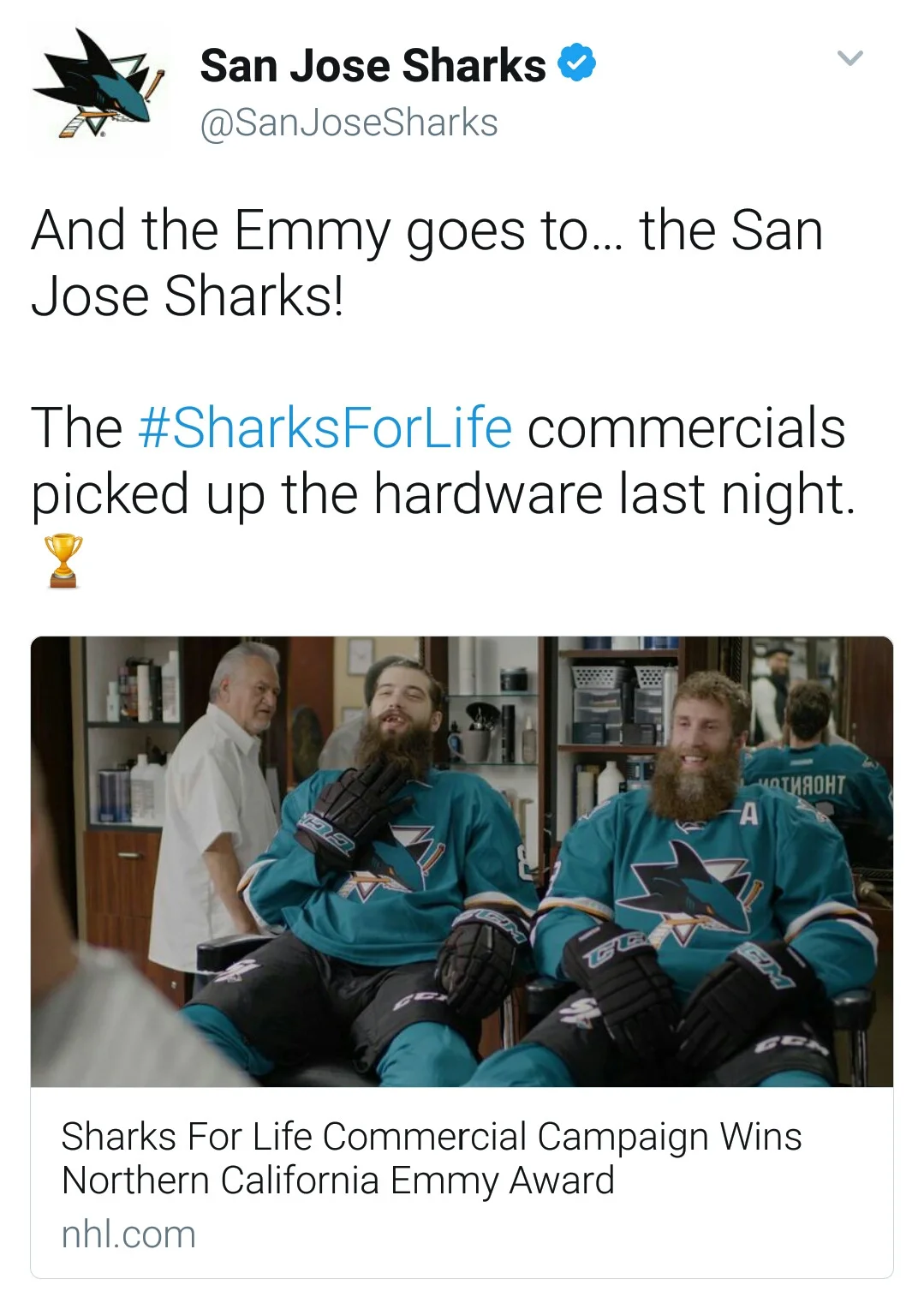 Congratulations to the San Jose Sharks, SJ Sharks Productions and Division Of Labor for taking home an Emmy Award for their 2016-17 commercial campaign. We have worked with the Sharks for a number of years now on these TV spots, contributing both production and post-production audio. If you scroll thru the blog here, you'll find several posts highlighting the fun we've had with, both the new team and previously with Shark's long time Creative Director Bob Kilburg of Big League Ideas.